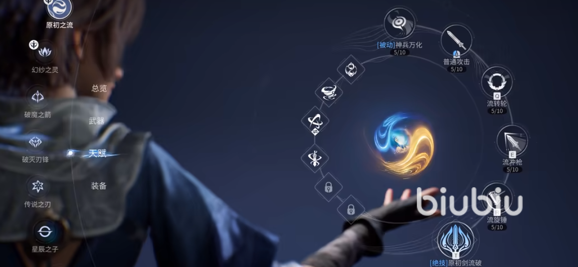 武器方面,因为元流之子是可以切换形态的,所以不同的形态下,其武器也会有所不同,三个形态下的武器分别是,灵活高续航的“流转轮”,爆发和高破甲的“流冲枪”和范围和场控极强的“流旋锤”,这几个武器可以在战斗中,随着形态的切换,随时进行切换。