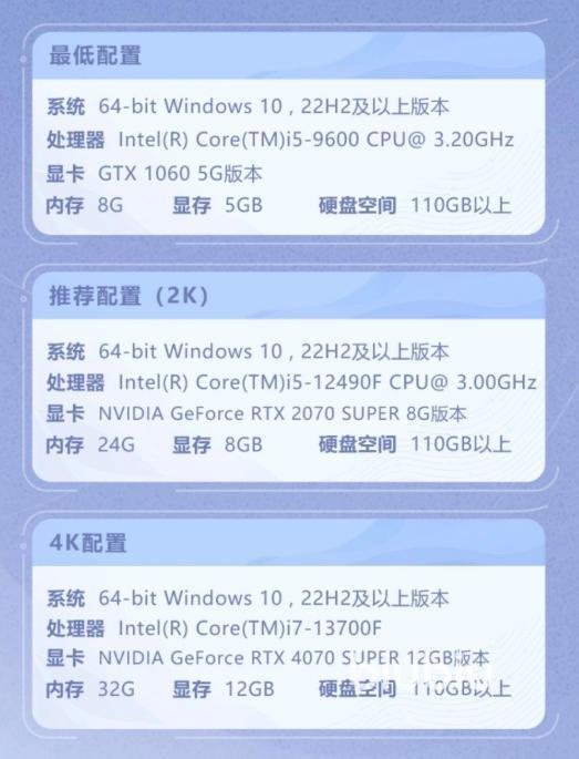 然后再来看看PC端,不管是台式机还是笔记本,存储空间的需求都在110G,这个体量非常大,媲美一些大型3A的体量了,因为里面的人物建模、场景都很绚丽,特效也很足,而且还有很多华丽的演出。至于运行内存需求,最低8G,推荐24G,如果要4K分辨率体验,那么则要32G。