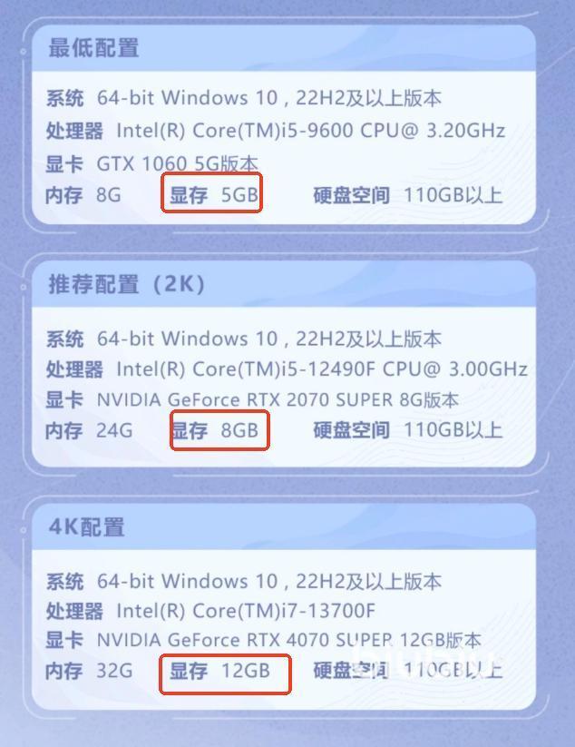 再就是硬件配置无法满足最低需求,也就是8g内存+5g显存的1060显卡,并且要预留110g的硬盘存储空间,可能不少人的显卡显存不够,这会导致在场景加载、人物模型加载的时候会突然很卡。