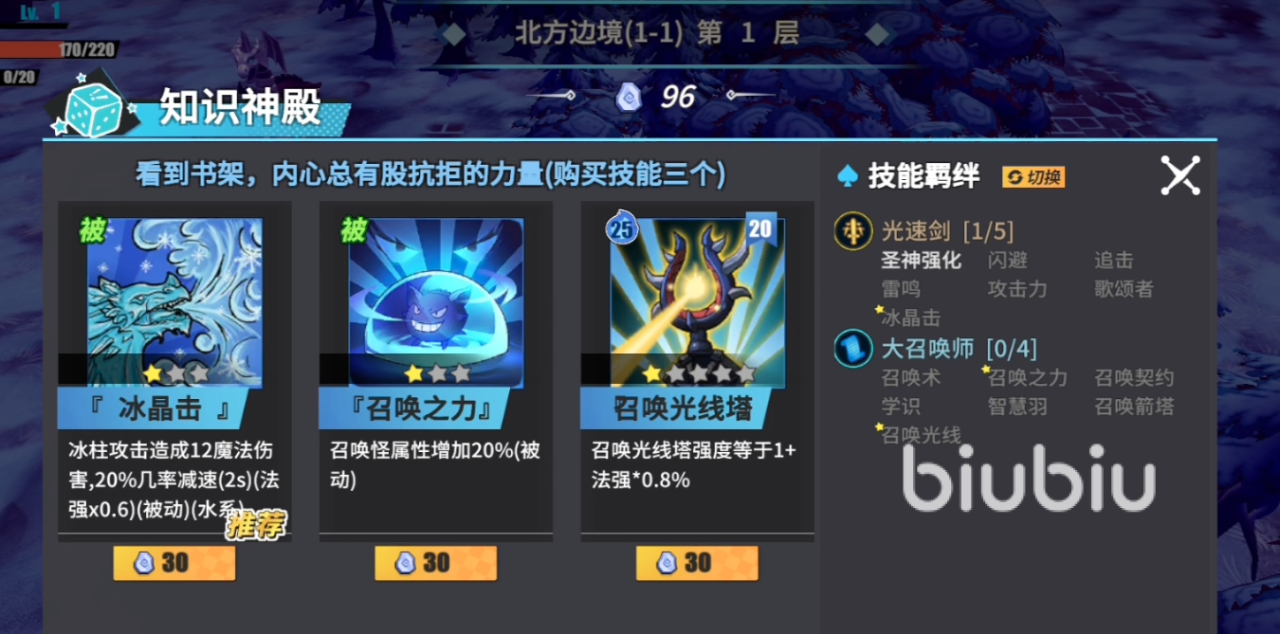 之后我们向左边进行移动,在左边的时候可以看到一个宝箱,宝箱附近有两个狼进行守护。还是按照刚刚的方法将狼击败。这个宝箱里面基本都是1级素材。接下来继续往下面进行移动,在走到最下面的时候可以看到左边有一个建筑,附近有两个敌人,玩家们将其直接打掉。之后可以进入到建筑中,这个建筑是知识神殿,玩家们在击败敌人的时候可以获取到符文。这些副本便可以在知识神殿之中购买技能。这些技能都是随机的,建议前期以强化召唤物能力为主