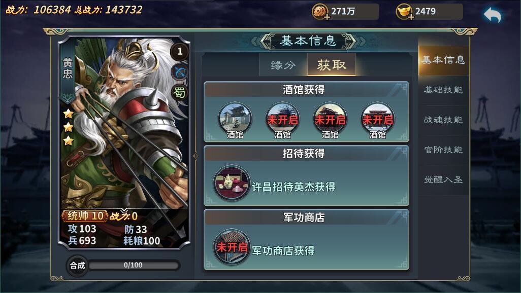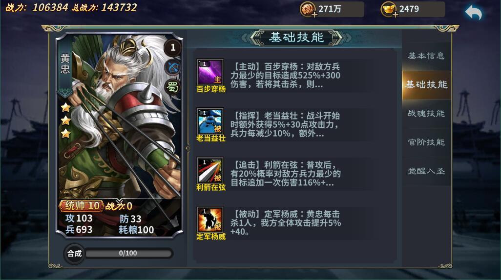 其自身的指挥技能老当益壮,会在战斗开始的第一个回合增加5%的攻击力。有了该技能的攻击力加成,黄忠的战斗效率会变得更高,不过大家需要注意,不能让黄忠损失过多的兵力。