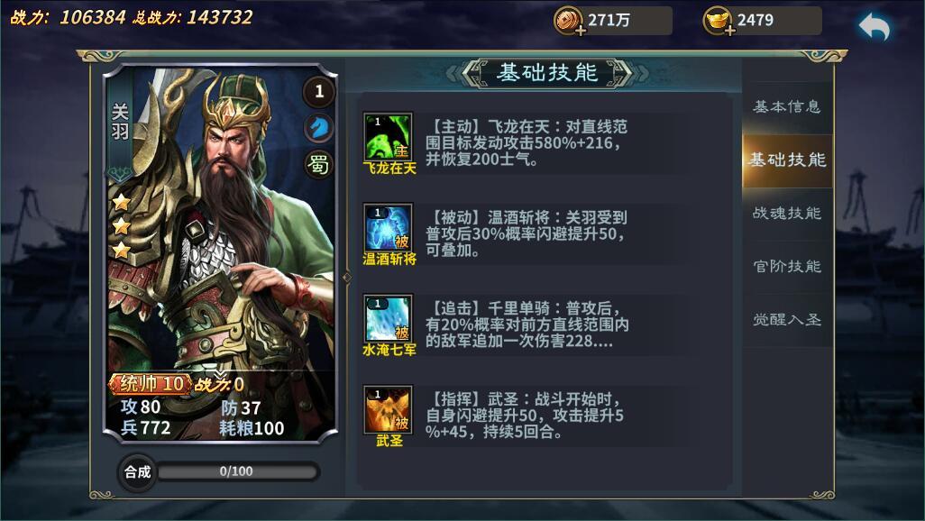 尤其是关羽的追击技能水淹七军,在普通攻击之后,会有20概率触发一次范围伤害。此时,范围当中的敌人都会受到高达228%的物理伤害。后期还可以依靠关羽的该技能,直接击破敌人的士气。
