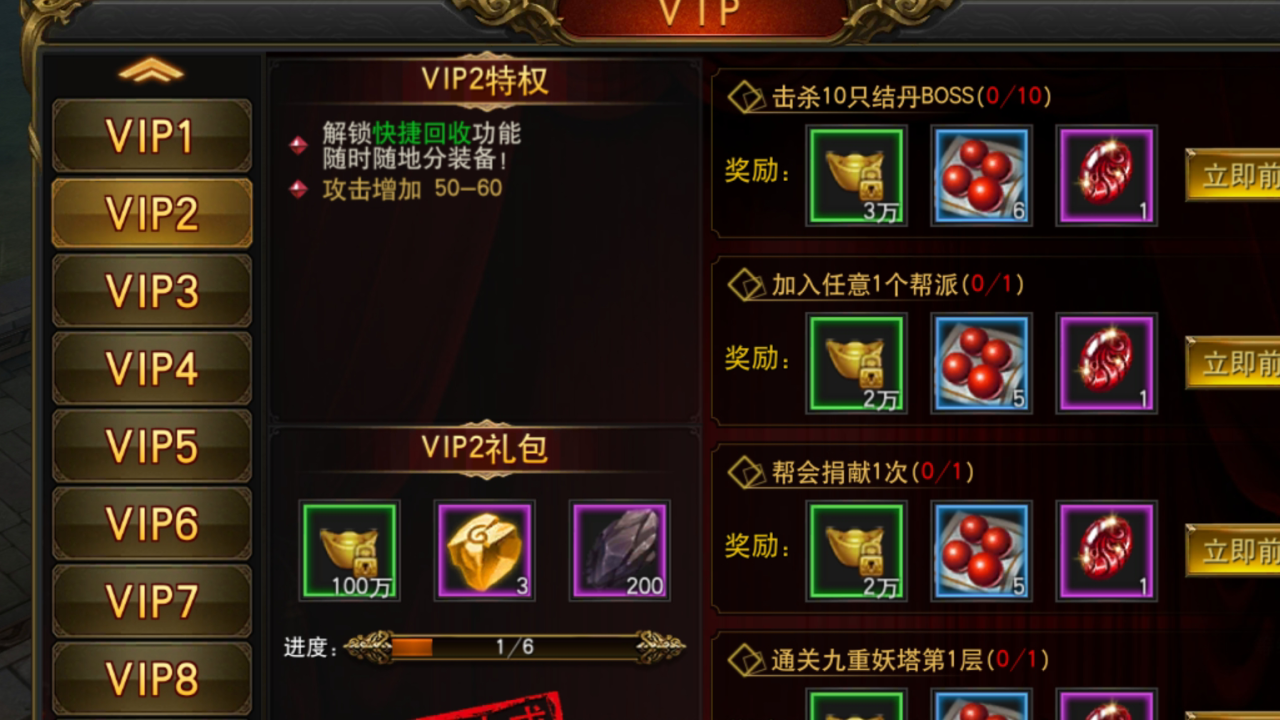 第一种玩法比较推荐那种时间比较充裕的玩家,毕竟VIP等级提高起来,福利会很多,比如说打怪的时候,经验会有加成,并且增加武将的气血和法力值,而且VIP到达一定等级,还会赠送非常强大的物件。所以说,钻石花费用来买VIP是一种十分理智的选择,而且有一个活动就是消费,有好礼,消费钻石能获得很多额外的道具,所以说,每当玩家在这个活动的时候,就去花费钻石买VIP就能得到将近两倍的报酬,非常划算,对自身实力的提升也非常的迅速。