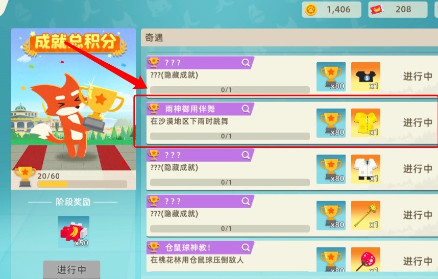 【雨神御用伴舞】奇遇的要求是要在下雨的沙漠跳舞,完成后就能获得道具雨衣和80点成就积分。