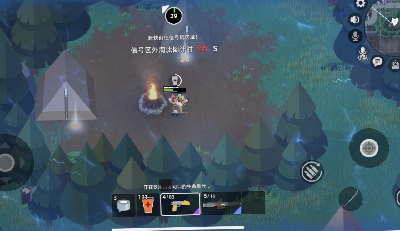 游戏中的动物岛上很多地方都分布着篝火,玩家不需要收集木材燃料等,只要在负伤血量不满的状态下靠近篝火,就能自动点燃,获得持续回复生命值的效果,血量回满后篝火会自动熄灭。此外,围着篝火边取暖边使用生命果汁的话,还可以提升生命回复的速度。
