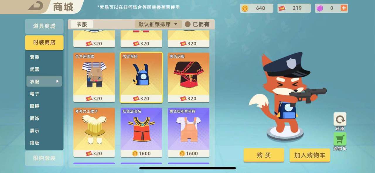在主界面左侧找打商城,在商城内点击时装商城,点选衣服类时装下拉,在下拉列表中我们就可以找到太空背包,可以看到购买太空背包需要蕉币320个,花费蕉币即可购买成功,在角色界面穿戴即可。