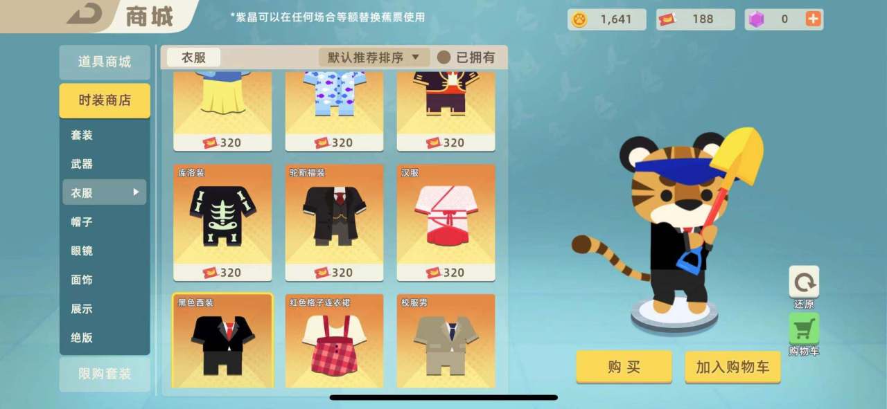 需要在商城使用金币进行购买,这是一件比较普遍的西装,穿上会像上班族,在游戏中会让角色显得很正经,充满趣味,比较适合搭配老虎角色。
