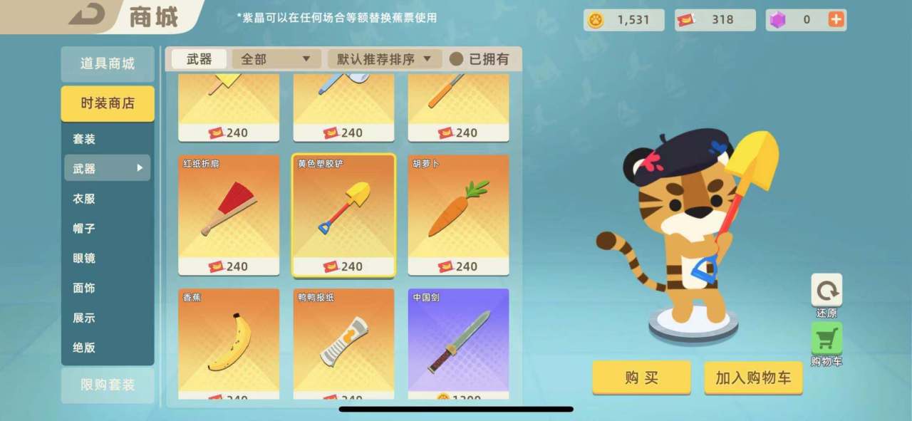 在外表中武器外表是最最常见的,有很多武器需要玩家在游戏中完成特定隐藏任务才可以获得,比如苍蝇拍广告牌等等,还有一部分只要在商店使用蕉币即可购买,大镰刀是游戏中非常有意思的近战武器外观,装备之后小动物就可以拿着长柄镰刀到处招摇,之后可以搭配囚徒套装或搭配穴居人装。大镰刀具体的获得方法是通过完成成就破坏王获得。