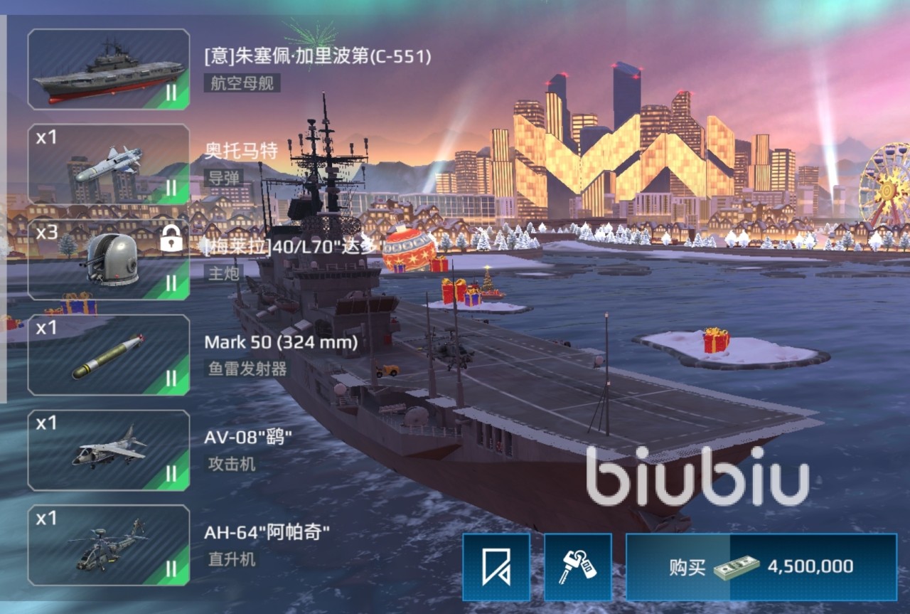 这艘航母上面搭载了梅莱拉达多型主炮、奥托马特导弹以及Mark50鱼雷发射器,具备一定的近战和防空能力,可以消灭靠近舰身的敌方舰艇,保护母舰的安全。此外,该型航母上面还能搭载鹞型攻击机和阿帕奇直升机,能够快速发现对手的潜艇和护卫舰,并对其进行有效打击,与其他同类航母相比,它的价格也不是很高,只需450万就能买到。