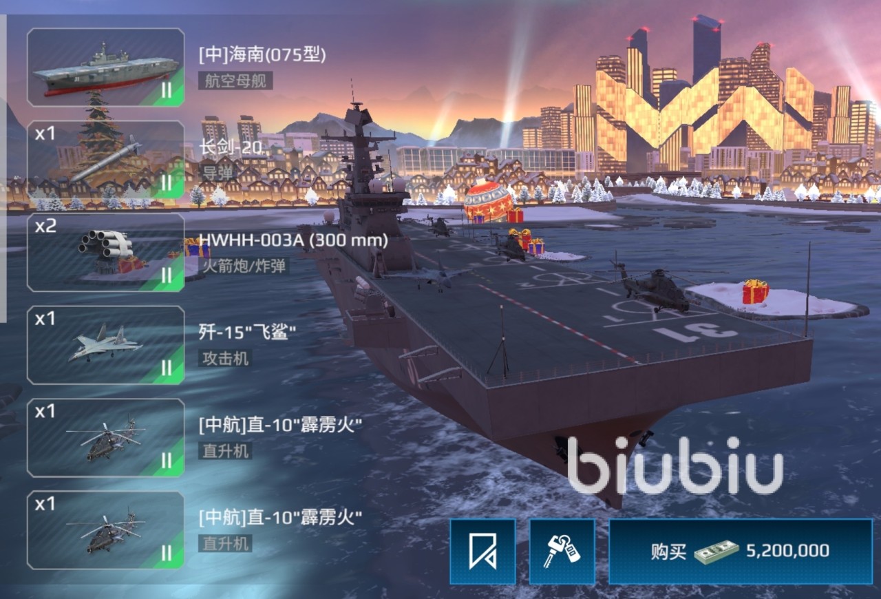 075型航母也就是海南号,上面配备了长剑20导弹和003A火箭炮两个防御武器,还能搭载歼15飞鲨和直10霹雳火等飞机,拥有不错的攻击能力。这个航母的机动性也很好,能快速抵达各个区域,上面配备的导弹,能在己方舰艇不在身边时,起到一定的防护作用。上面配备的多个直升机,能帮你完成反潜任务,提前消灭潜伏在附近的潜艇,为小队消除隐患。