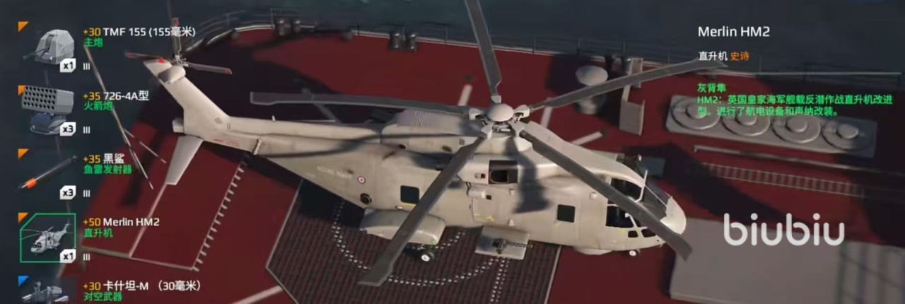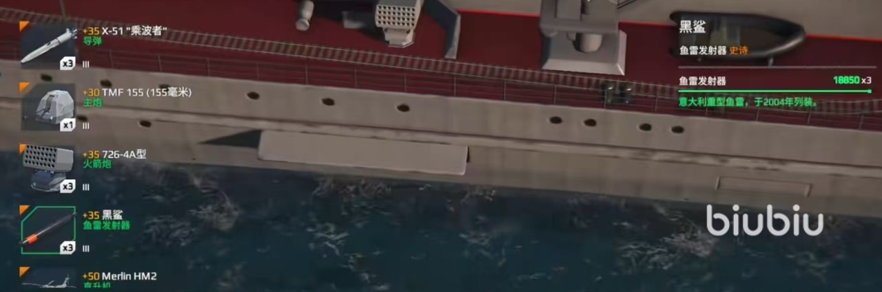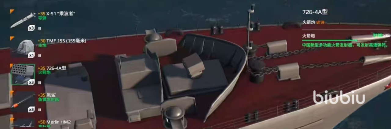 虽然自身在基础方面比较有优势,但是为了能够更好地承担抗线的任务,后续装备搭配也必须要精挑细选。在装备选择方面,导弹推荐乘波者导弹,主炮方面选择使用通行证活动赠送的TNF155毫米主炮,火箭炮选择726-4a型,鱼雷发射器选择黑鲨。最后是直升机推荐使用灰背隼,在反潜方面非常出色。