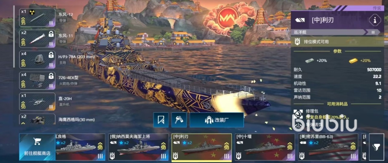 利刃巡洋舰在推出之后经过了多个版本更迭,从目前来看,强度还是比较可观的。在锁定武器方面,拥有着东风11反舰导弹,伤害非常不错,但是装填时间比较长,所以实战效果打了一些折扣。还有一样武器是电磁主炮,这个电磁主炮各项数值都比较出色,是利刃的重要输出来源。最后一个是锁定电磁火箭炮,电磁火箭炮拥有着较强的属性,在实战中和主炮配合打出稳定的强制伤害。