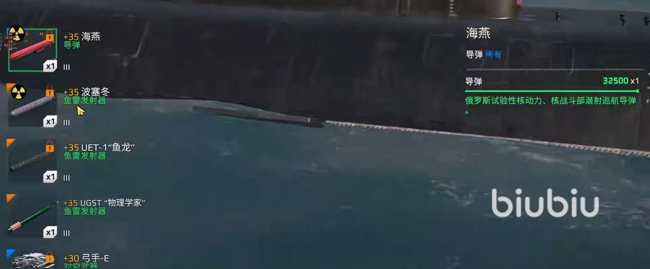 先来看下别尔哥罗德的基础数据,耐久方面40万左右,速度16.4节,从耐久和速度来看还是有着一定的优势,尤其是速度比俄亥俄要高一些,潜艇速度非常关键。其实这个潜艇令很多玩家认为它比较变态的地方,就在于它的各种核武器,包括波塞冬鱼雷发射器,海燕导弹等,这些都是非常有特点的地方。