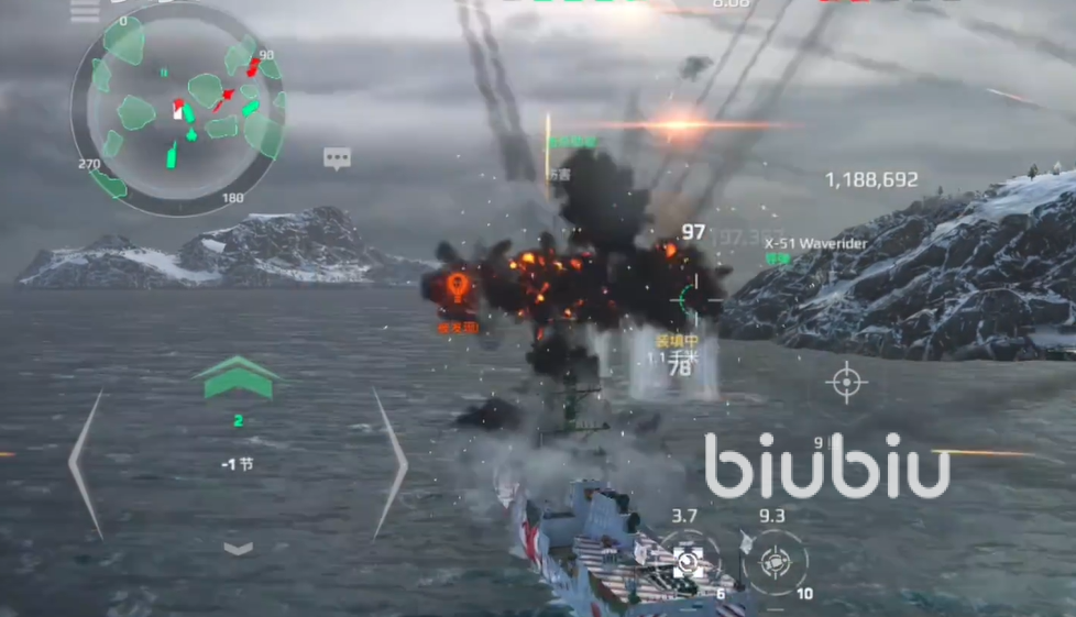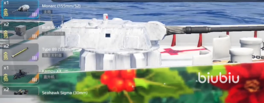 这个战舰搭配的导弹武器为双x51,该导弹的锁定范围很大,可以远距离对周围的战舰造成伤害,尤其是天空中战斗机不断包围的情况下,使用可以使用该导弹造成范围攻击,从而提高自身的清图速度,然后主炮方面使用莫娜克155,这个主炮的优势在于持续火力很猛,而且稳定精准很好,面对机动性高的战斗机也是能精准无误地打击。