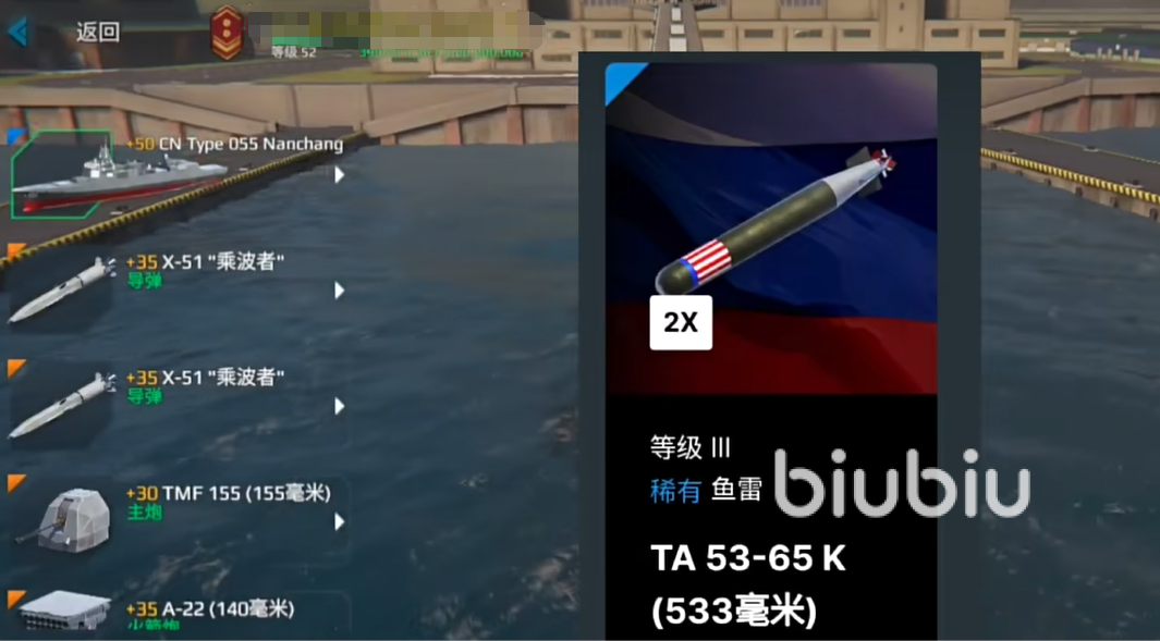 接着继续装配鱼雷,鱼雷的话,推荐大家使用TA 53-65 K。这种鱼雷的下潜速度更快,而且可以迅速来到敌军战场。并且造成高额的电属性伤害,甚至有可能将敌军的船给击溃,十分给力!可以一次性装配两个,连续发射伤害更高。