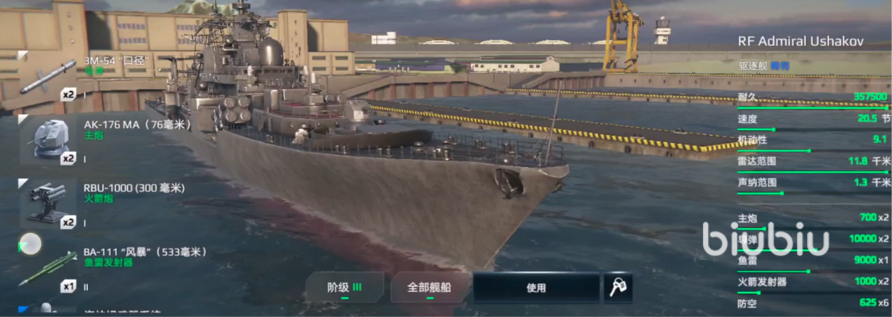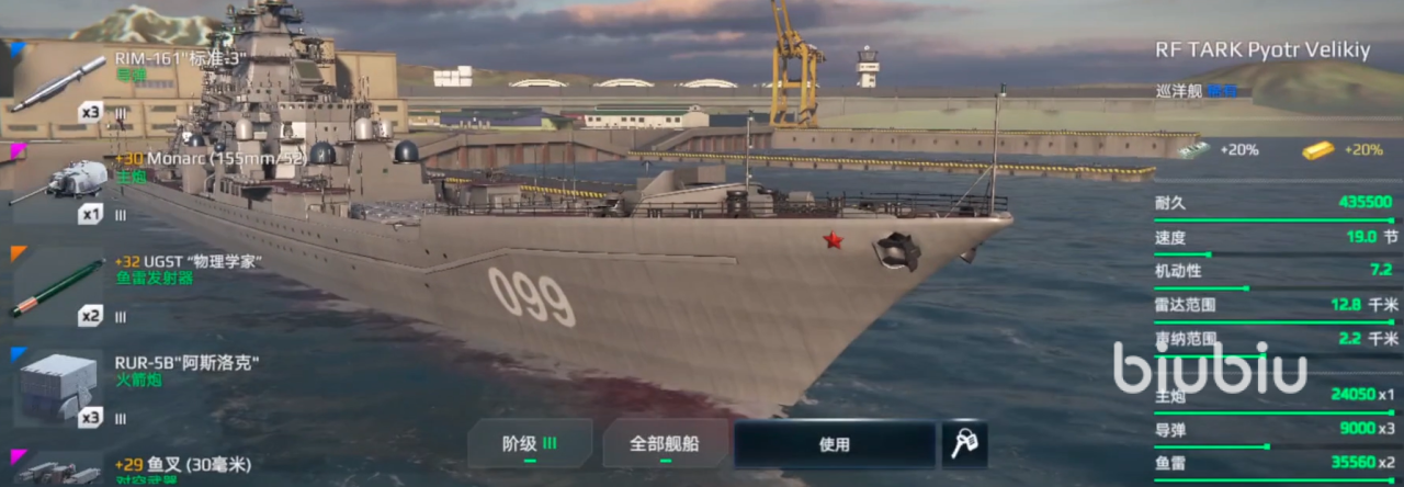 第三艘则是大名鼎鼎的彼得大帝了,他拥有着整个游戏为数不多的强大火力。并且可以装下三枚导弹,所以爆发性伤害更高。另外还可以装配一门主炮再加上两枚鱼雷,再搭配三门火箭炮,就是一艘行走的战舰,让人感觉恐怖如斯。不管是日常刷钱还是真人局,都特别好用。