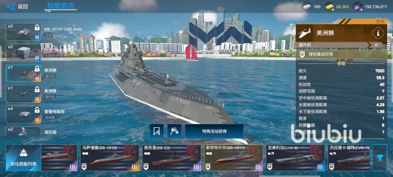 自身的锁定武器比较多,例如主炮MK-37 305毫米主炮,美洲狮直升机,重锤电磁炮,萨德等,都是属于锁定类型。不过这些武器在实战性能方面比较优异,尤其是美洲狮直升机,拥有7000耐久,58.3机动性以及很不错的视野范围和侦察能力,还能够使用携带的AGM-86导弹和GAU-19机枪来进行输出。在生存能力方面,属于战列舰的中等水平,可以承受一定这样的攻击而保证自身存活。速度方面,结合自身最大速度以及机动性,虽然不算特别优秀,但是在战列舰中已经是属于具备较好机动性的一艘,可以相对灵活的转向和躲避攻击。