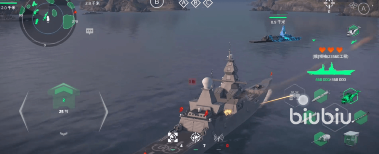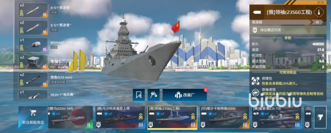 领袖级驱逐舰以俄海军“23560工程”为原型设计,在游戏中定位为“全能型战舰”。其基础属性包括44.2万生命值、27.8节航速和8.8公里雷达探测范围,配合隐身能力,能在复杂战场环境中灵活穿梭。火力配置上该舰拥有4个导弹槽、2个火箭炮、2个黑鲨鱼雷和1架直升机搭载位,单轮爆发伤害可达20万,尤其适合中远程突袭。不过,其防空能力较弱且机动性一般,需依赖队友配合弥补短板。