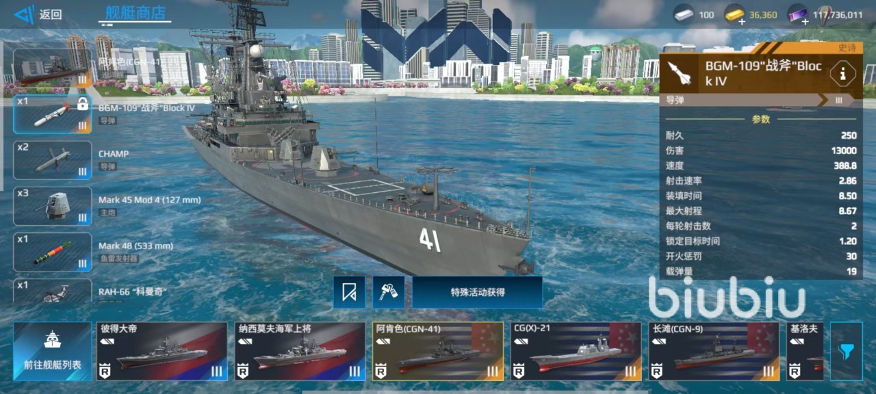 修理包能够恢复20%耐久,干扰弹可以使敌方常规导弹失去目标,弹药储备能够直接补充20%弹药,电子对抗能降低制导武器15%伤害。在装备方面,携带了三枚导弹,三门主炮,一具鱼雷发射器,一架直升机,二架对空武器和六架自动炮。值得一提的是,它有着两款锁定武器,分别是史诗品质的BGM-109战斧导弹和史诗品质的mk38自动炮。这款自动炮的伤害和速度都非常出色,所以在防空方面有着不错的表现。