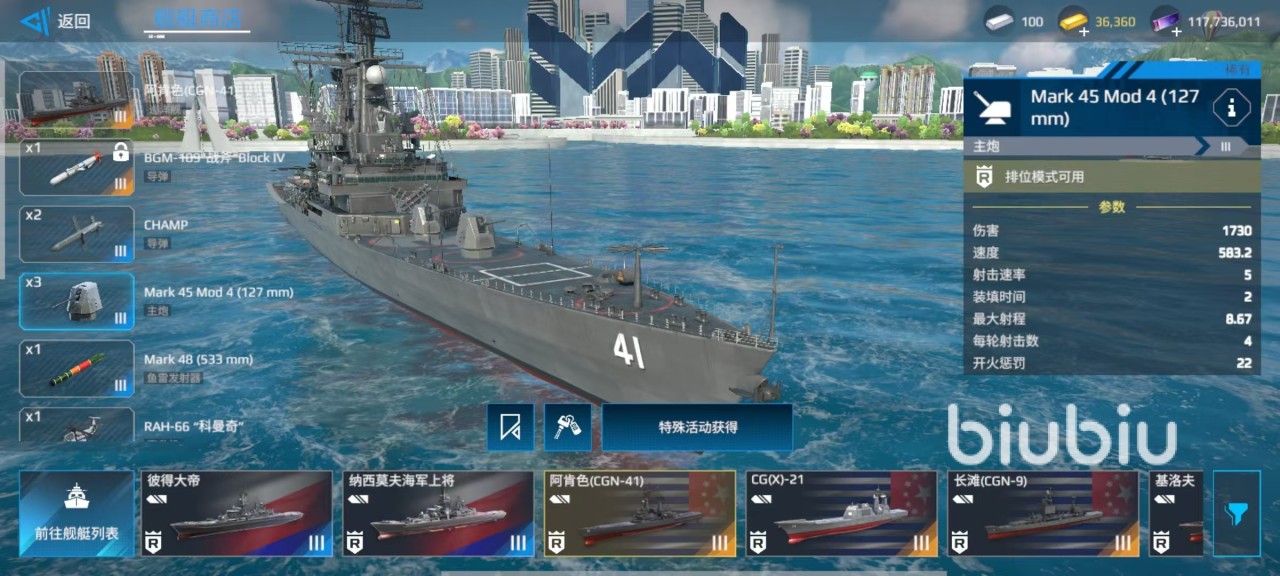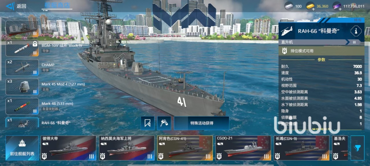 锁定的战斧导弹更是有着高达13000的伤害,再配合上另外的两个导弹槽,搭配得当后,一轮导弹输出就可以打出恐怖输出,让对方直接残废。自身主炮,初始携带主炮口径只有127毫米,伤害1730,主炮方面是比较拉垮,不过可以进行更换,通过更换更大口径的主炮,也是可以打出更高的输出。自身携带的直升机是科曼奇,这架直升机中规中矩,如果能够更换成更强势的直升机,属性还能进一步提升。