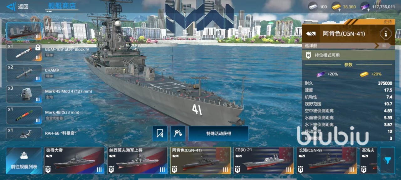 阿肯色巡洋舰是一艘需要通过特殊活动才能获取到的舰船,并非常规的金条船,这就使得在获取方面有一定的难度,当然也能够在战斗中获得更多的货币奖励。在自身常规属性方面,耐久为375000,速度17.5节,机动性7.4,视野范围10.7,空中被侦测距离4.83,水面被侦测距离5.33,水下被侦测距离3.67。消耗品方面,可以携带修理包、干扰弹、弹药储备和电子对抗。