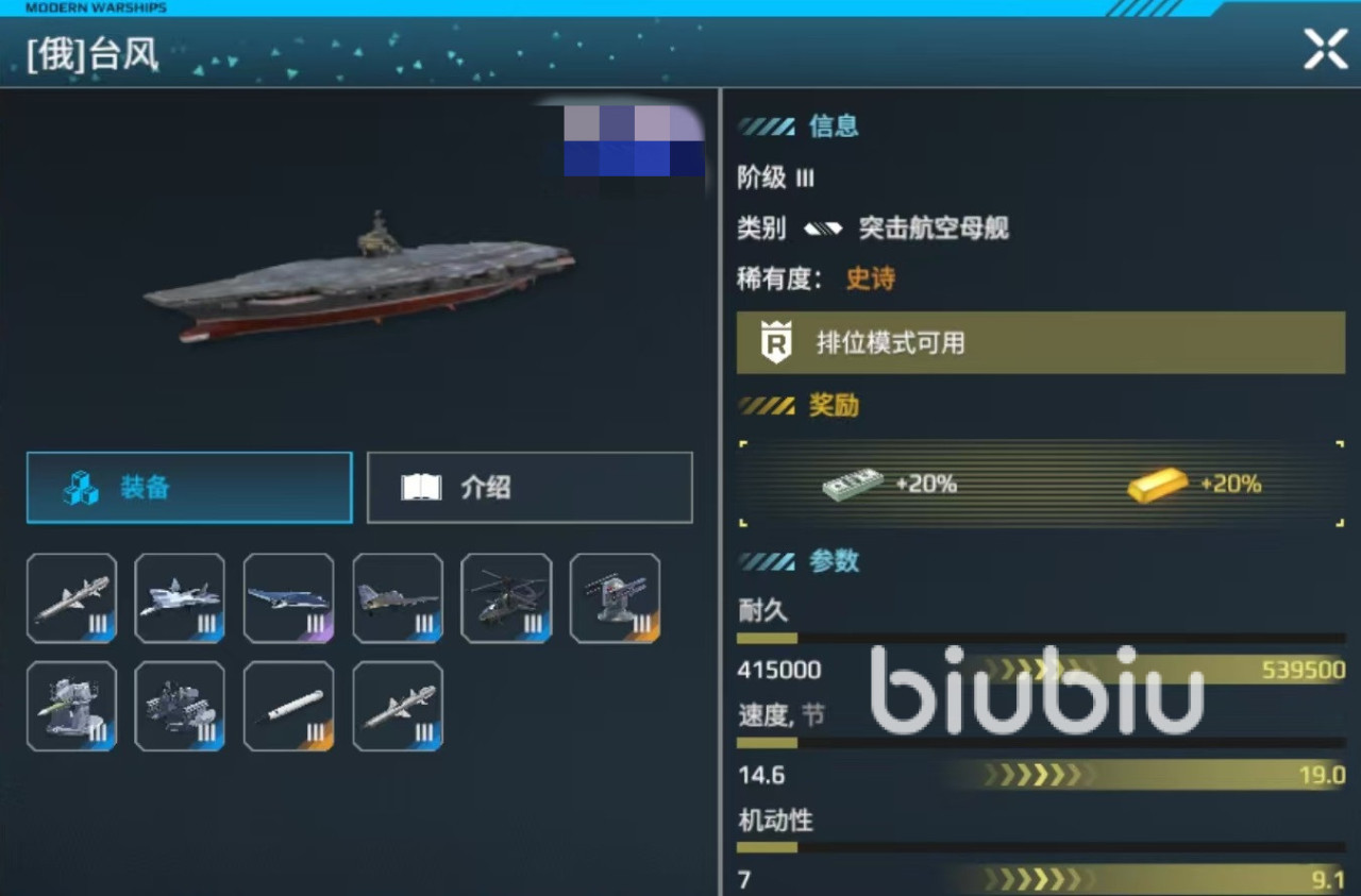 台风是属于突击航空母舰类型,和企业号、004以及瑞鹤等都属于同一分类。这也是属于一艘虚构架空出来的舰船,是游戏中的独创,该舰采用核动力设计,装备了用于打击敌方军舰的反舰导弹,并拥有数量规模非常庞大的防空武器。在属性方面,大家提升到满级之后,耐久为539500,速度19.0节,机动性9.1,视野范围12.8千米。所拥有的武器装备包括三座导弹,一架战斗攻击机,一架轰炸机,一架无人机,两架直升机,六座自动炮和九座防空。