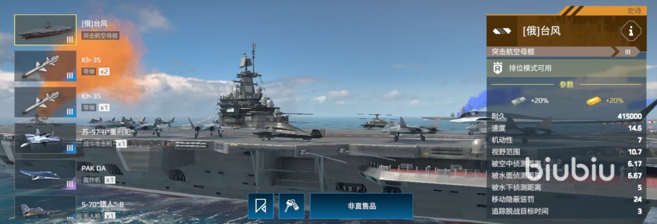 作为一艘核动力突击航空母舰台风号,具备航空打击能力,还拥有很强的反舰、防空以及自卫能力,它的单独作战能力非常突出。舰载武器和空中编队都可以根据玩家的喜好以及战斗需求自由进行搭配,满足了不同玩家的战术需求。高达53万的血量,属于血量比较高的一类,可承受一定量的攻击,先进的防空系统和武器配置,在战斗中也可以为团队发挥出很好的作用。