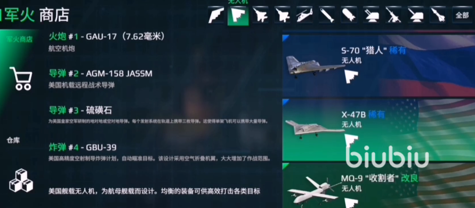 X-47B无人机,火力强大,适合远程打击。KUS-FS无人机,综合性能优秀,适合多种战术需求。猎人无人机,机动性强,适合快速侦察和打击。
