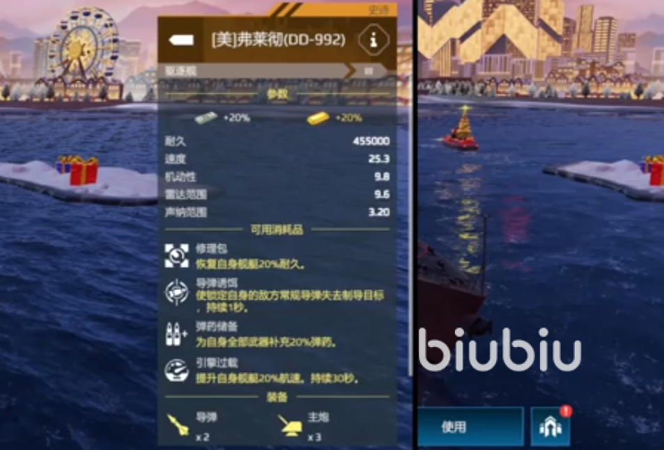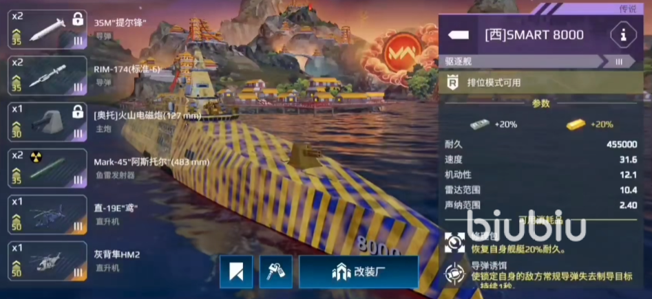 这是目前售价最高的驱逐舰,整体的数值自然也是非常的“超标”。机动性非常高的舰船,极速能达到30节,而且它的体型非常的小,行动起来就更加的灵活。它具备的锁定导弹提尔峰的性能也是顶尖的存在,如果配合灰鲭鲨就能打出非常恐怖的伤害。能装备CD短,但是伤害爆炸的电磁炮,还能装配2个自由鱼雷,可携带2架武装直升机设备,外加2CH1,在瞬间就能打出成吨的伤害;还可以装配2架直20变身反潜超人。不仅如此,它的防空能力也是一顶一的存在,血量也是比较可观,全方位的属性都非常在线,是全面全能型的舰艇。对于新手来说也非常合适,装备额外的配套设备,还能再提升战斗力。