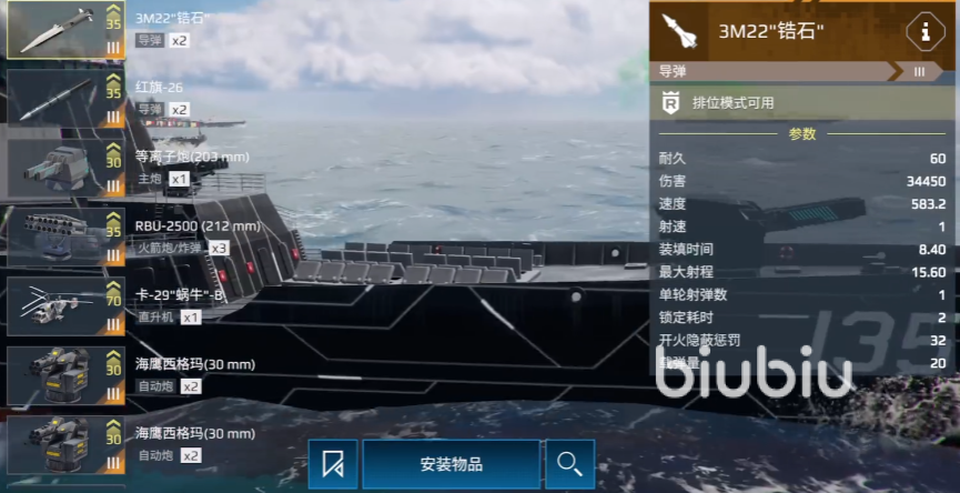 一号导弹槽位采用的是登录签到送的鹰击21,二号槽位用的是40式高超滑翔弹,主炮可以用英炮,也可以用sh16。火箭弹用的是Rbu-10000,很适合用来刷人机。