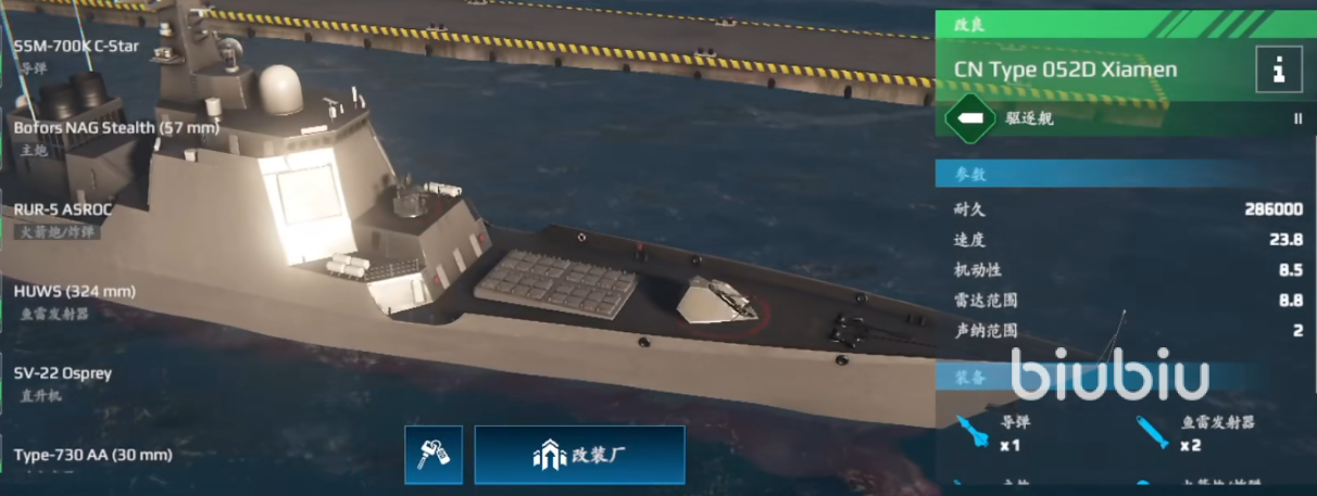 一艘功能较为全面的二级舰艇,配备了导弹、防空和鱼雷系统,是少有的具备完整武装体系的舰船之一。其主要优势在于可以提前让玩家熟悉三级房中复杂多样的战斗节奏和火力组合,适合作为前期过渡与战术适应使用。尽管在个体强度上并不突出,但凭借其均衡性能和适配性,仍然是值得拥有的一员。