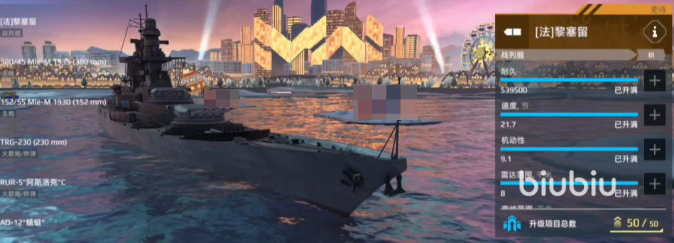 作为法系战列舰的代表,黎塞留以卓越的武器布局和强大的战斗能力著称。其搭载的两组四门火箭炮在反潜战中表现出色,引擎传动性能优异,防空能力强大。尽管血量稍显薄弱,但整体强度依然突出。