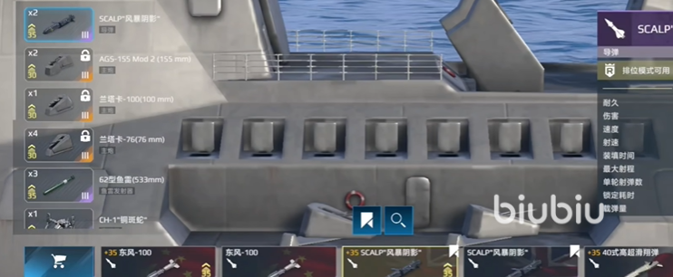 该舰拥有 7 座锁定电磁主炮,如 AGS-155Mod2 单轮攻击 68640,射程达 12.13km。然而普通的印尼巡洋舰则配置 12 门 152 毫米主炮,其射程远、单发攻击数值高,实现中远程压制敌方战列舰或固定目标123。