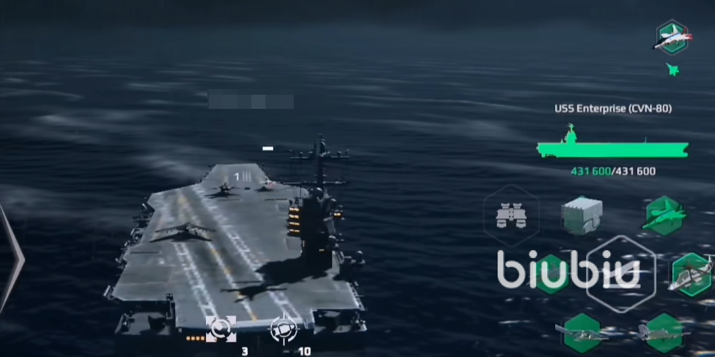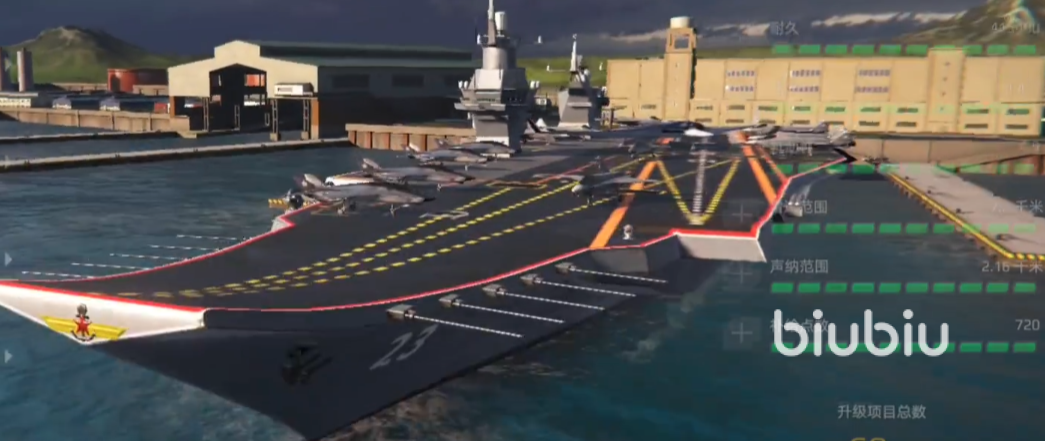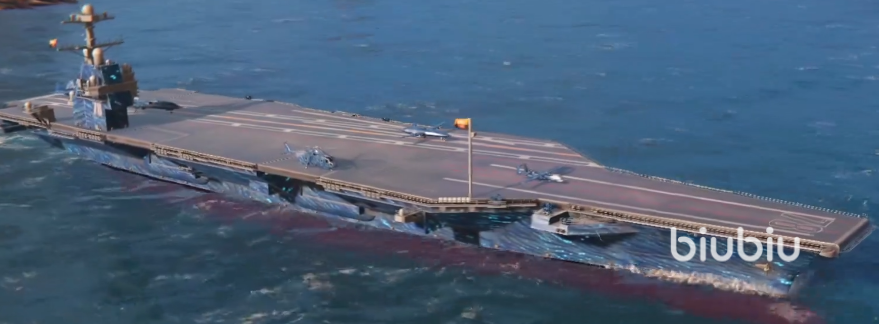 这艘算是现代航母的巅峰之作了,拥有极其强悍的火力输出,堪称空中打击的移动堡垒。它可搭载大量战术无人机,实现高频率打击,并配备宽敞的飞行甲板,舰载机起降循环效率极高。其特殊的“战术核导弹”技能(仅限活动获取)在关键时刻具有毁灭性威胁。然而,由于体型庞大,机动性与自卫能力较弱,实战中极度依赖护航舰队。