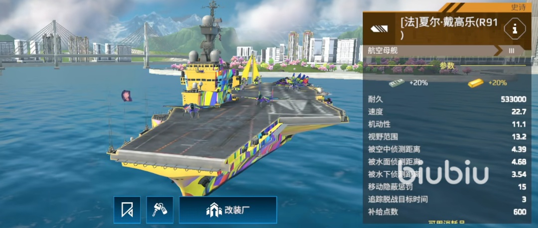 这艘日系航母将传统航母设计与现代系统融合,具有独特的战术美感。其双跑道设计提升了舰载机起降效率,可高效部署大规模攻击编队。然而,其火力配置相对单一,主要依赖舰载机输出,实战中需优先争夺制空权,发挥空中压制的优势。