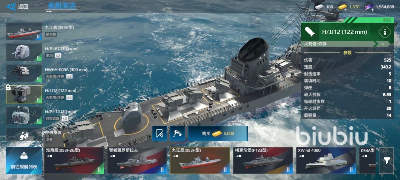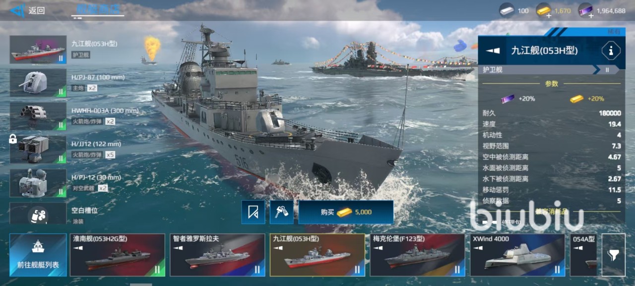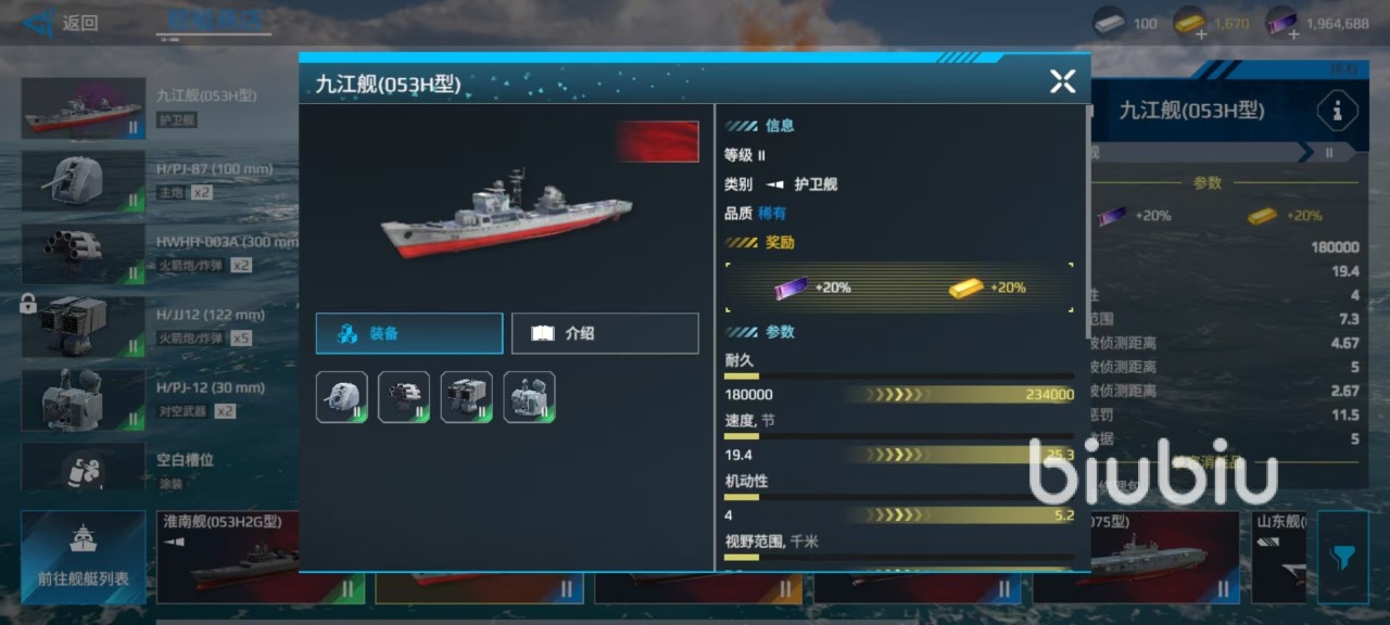 九江舰的原型是053H型,是一艘护卫舰,自身在二级舰船中还是有着比较高的人气,它是属于一艘金条船,需要5000金条才能入手。在基础属性方面,当提升到最高级时,耐久值为234000,速度25.3节,视野范围8.8千米,空中被侦测距离3.97千米,水面被侦测距离4.25千米,水下被侦测距离2.27千米。在装备方面拥有两门主炮,七具火箭炮发射器和两座对空武器。