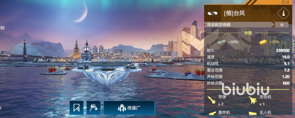 在本轮平衡改动中,暴风雨同样获得了导弹补强,目前搭载三枚导弹、两枚火箭炮与两架直升机,是现有突航中自卫能力最为强悍的一艘。然而其代价极高:无论是血量、航速还是机动性,暴风雨在所有突击航母中几乎都是垫底存在,缺乏有效的转点能力,在面对战列舰远程锁定时几乎难逃一死。此外,其防空网薄弱,仅依靠三个S-400应对导弹,拦截效果相对有限;而没有无人机的配置,也限制了其整体作战上限。