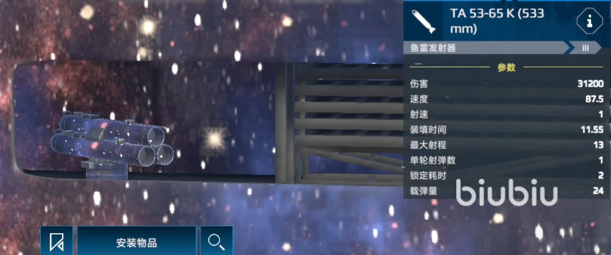 TA 53-65 K、A244 SLWT(茄子鱼雷)等型号也非常值得关注,前者射程长和伤害高,适合打航母等大型目标,但速度稍慢,容易被拦截,后者灵活速度快,适合多目标压制、扰乱,搭配主动声呐效果更佳。