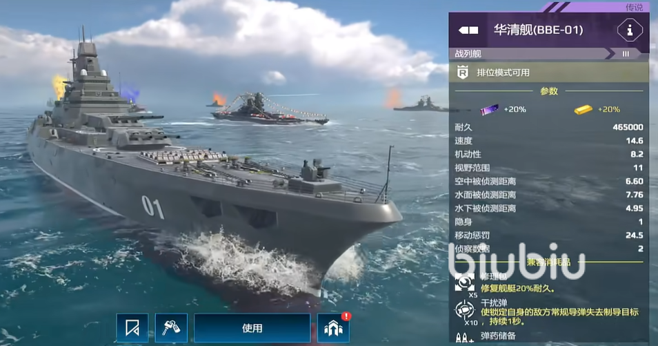 华清战列舰的火力输出也很猛,配备3座三联装410毫米电磁轨道炮作为主武器,每次攻击都伤害巨大。而且副炮的射速还快,可在近距离战斗中提供快速的火力支援,能够高效压制敌方小型舰艇,所以近距防御能力也很出众,敌人很难近身。不仅如此,它的生存能力同样优秀,生命值相当可观,可以有效保护己方的输出舰船。