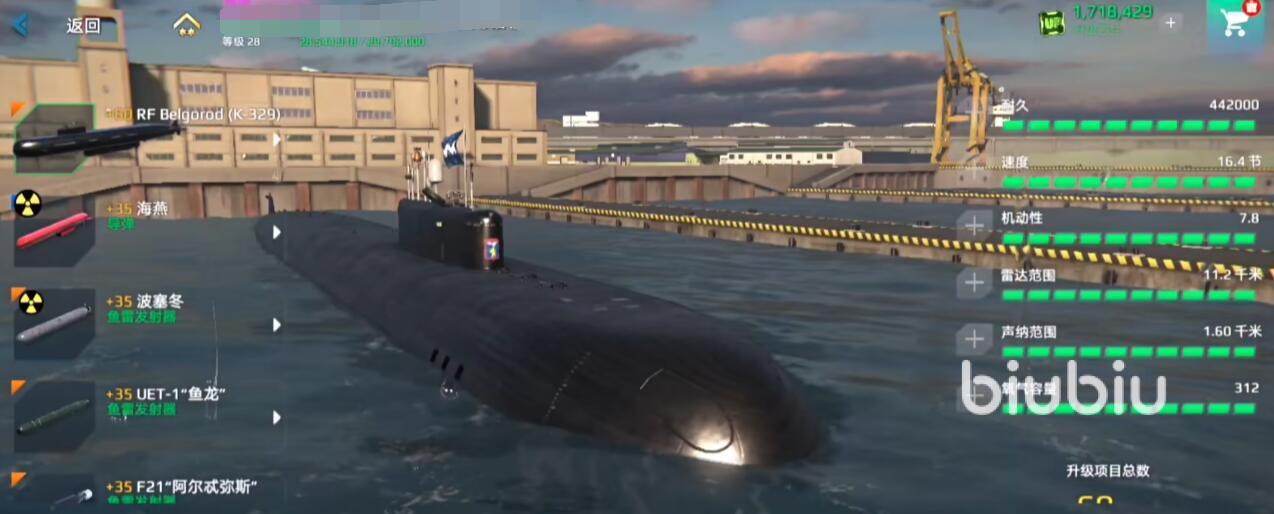 别尔哥罗德号在游戏中巨大的能力在于其武器要求足够强大,并且能够在超深的深海里面隐藏。所以在武器选择方面,优选阿斯托尔核鱼雷,这款核武器,拥有103节的速度,可以轻松穿透大多数防御系统,单发威力足够有30万当量,足够能够瘫痪一个舰队的实力。没有足够资金购买这款核鱼雷,还可以选择波塞冬核鱼雷,当量伤害只有阿斯托尔核鱼雷的三分之一,穿透力稍显不足。导弹搭配上可以选择上浮发射的战斧巡航导弹或潜射型导弹。