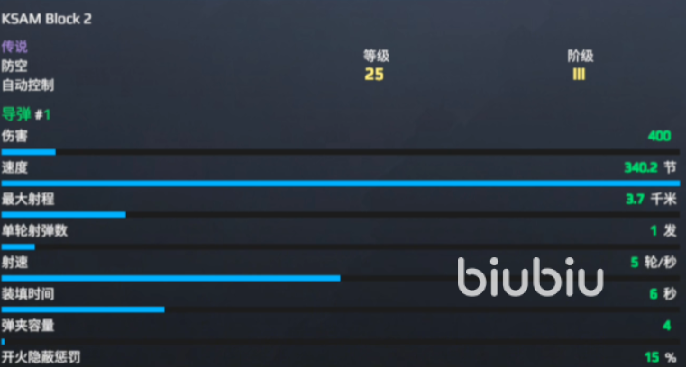 KSAM BLOCK 2,这个是在最近更新中新增的防空炮,仅需2500金条,数据也是蛮不错的。传说品级的防空炮,单发伤害520,装填时间4.2s,最大射程4.77。击落攻击机用时28秒,击落轰炸机22秒。