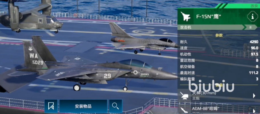 F-15N,性能十分均衡,这款售价33万美金的战斗机在战场中以综合性见长。其满级耐久为4290,在同等级战机中属于中上水准,同时搭载了火神机炮、一组哈姆导弹、一组企鹅导弹和一发无制导航弹。虽然导弹群的单轮伤害并不算突出,例如哈姆的单轮为1.8万、企鹅仅1.5万,但凭借其火力密度与持续输出能力,整轮爆发可达8.9万,满伤输出为18万,稳定可靠。机炮射程2.5公里,射速适中,弹夹容量和换弹时间都较为合理。速度方面,其极速为733,中速633,反应尚可,适合喜欢稳健推进、边缘火力掩护的玩家。
