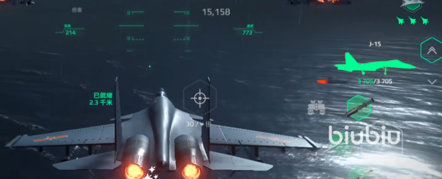 歼-15,极具操作感,31.5万美金售价,虽然耐久仅有3705,偏向“脆皮”类型,但极速高达773,在二级房中处于领先位置。其最具杀伤力的是搭载的鹰击-83导弹,该导弹射程5.9公里,双组备弹可实现连续火力压制,单轮伤害达5万,爆发力极强。搭配70mm火箭弹与中俄通用30mm机炮,构成了快速点射、高速拉打的打法核心。实测单轮输出8.9万,满伤输出20万,属于中高水平。这款战机更适合擅长快速游走、规避打击并寻找机会集火的高操作型玩家。