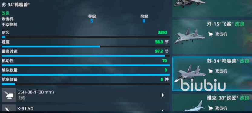 苏-34鸭嘴兽,高爆发战机,售价仅30万,耐久方面达到4225,表现不俗。武器搭配上,它拥有中俄通用机炮、一组X-31导弹、无制导火箭弹以及一组航弹。其中X-31导弹以其7.8公里的超远射程和高达6万的单轮伤害,成为远程开局压制的重要武器。火箭弹与航弹在近距支援方面也能发挥补充作用。实测其单轮输出高达11万,满伤更是达到惊人的24万,居于当前二级战机输出的顶点。这架战机极为适合擅长预判与远程封锁的玩家,特别是在团队协作中担任核心输出位时能打出亮眼表现。