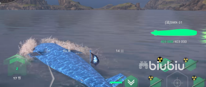 SMX31,全能战神,拥有不俗的速度与极强的机动性,火力方面配置为4鱼雷+3导弹,搭配其极小的受弹面积和巨大的鱼雷/声呐探测范围,使其在水下作战时几乎无死角。氧气也属于较高水准,支撑它长时间潜行作战。该艇既可以玩潜射,也能走水面流,但在当前版本中,水面流综合强度更高,爆发和节奏感更适合中高强度对局。需要注意的是,其两颗鱼雷位于侧翼,实战操作时必须注意走位角度,否则容易造成打击失效。