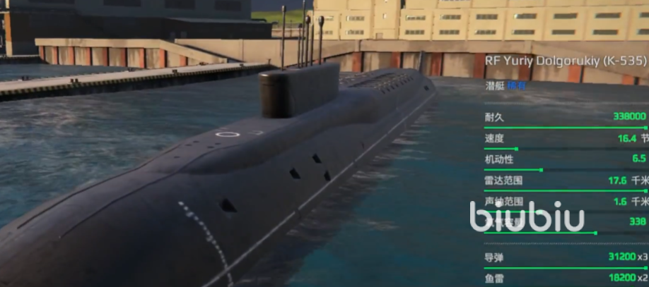 别尔哥罗德,配置豪华,拥有强大的锁定武器系统,血量和氧气储备也极为充足,可在战场中久战不退。其在残局阶段的表现尤其出色,自带防空能力可压制敌方直升机,因此被誉为“残局战神”。缺点也很明显:机动性差、速度慢,在面对高机动水面舰时容易被风筝;鱼雷输出速度慢、打击滞后。