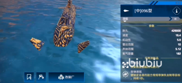 094型,属性全面,速度、机动性与氧气都在上乘水平。原本唯一的短板是火力较低,但在后续版本中补充了一枚导弹,显著提升了其输出能力。现在的094既能打潜射流,也能玩水面流,特别是在水面模式下,其伤害表现更加稳定可靠。