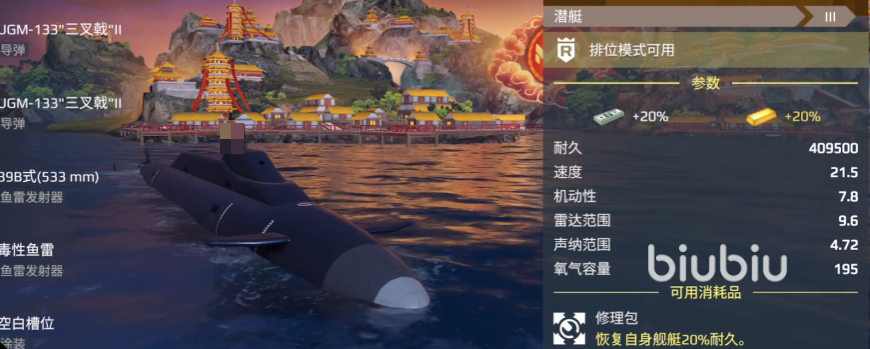 096型,在属性方面略逊一筹,氧气偏低,但其火力结构颇具看点,采用“4导弹+3鱼雷”的设定,并且导弹配置为2+2布局,使其在水面压制中具备不俗连发能力,尤其搭配X51导弹后,操作流畅度和输出稳定性都有保障。