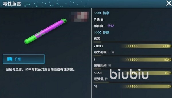 毒雷,一种装填时间极短、锁定速度极快的轻型鱼雷,攻击范围为10公里,装填仅需8.05秒,锁定时间更是仅为1.5秒。最大速度优于旗鱼,耐久也稍强,但单发伤害依旧不高,仅2.7万,AOE范围和伤害也不如旗鱼。实战中,毒雷的优势在于快速反复发射扰敌,而不是一发制胜。