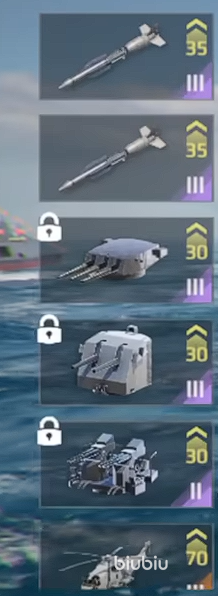 就属性来看,水面的侦查属性和耐久还有速度属性都是相当不错的,是能排到战列舰前列位置的。之后是武器装备,对比属性来说武器装备更能决定一艘船的强度,这艘船在武器装备的搭配上搭载了三枚355mm的导弹。
